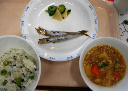 今日の給食の主食は、<わかめ入りグリンピースごはん>です。1年生が、旬のグリンピースのさやむきをして、給食作りのお手伝いをしてくれました。他の子どもたちも、1年生に感謝の気持ちをもって食べてくれたようで、残食も少なかったです。