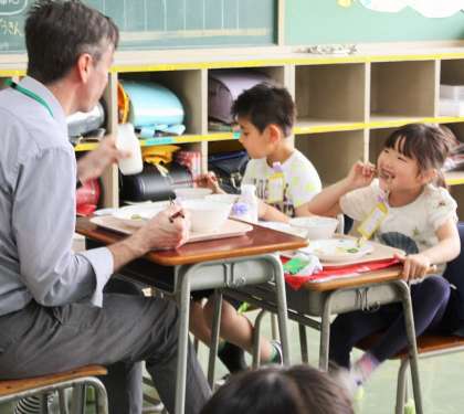 1年生の授業後には、ジェフ先生と一緒に給食を食べることができました。