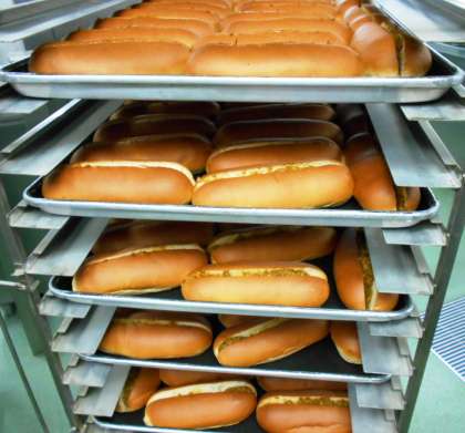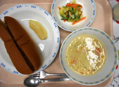 今日の給食の主食は、<カレーミートサンド>です。カレー粉やケチャップで味つけした豚肉と4種類の野菜をパンにはさみ、オーブンで焼きました。カレー味は、好きな子どもが多いので喜んで食べていました。