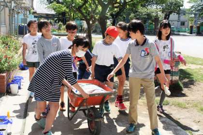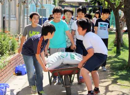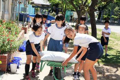 いろいろな野菜を育てるには、まず土作りが大切です。先週は3年生が畑の雑草を抜き、畑主任の関谷先生が耕耘機で土を耕し、今日は5年生が肥料をまきました。