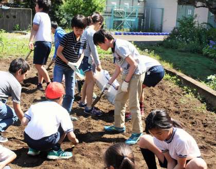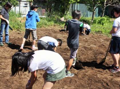 今後、1・3年生がなす、トマト、ピーマンの苗を、2・4年生がきゅうりの苗を植えます。伸びたつるを誘引したり、脇芽を摘み取ったり、まだまだ作業は続きます。たくさんの野菜が実ることを楽しみにしながら、全校児童で協力して野菜を育てていきます。