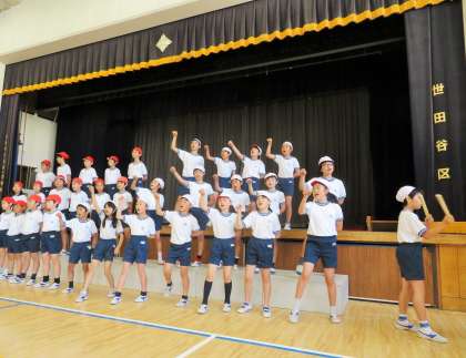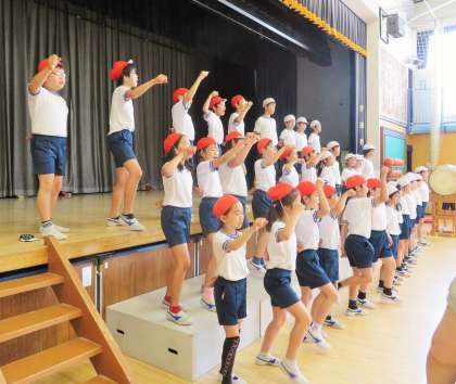 今日の音楽朝会は運動会の歌の練習です。4〜6年生の応援団がお手本となって歌ってから練習を開始しました。応援団の声はとっても立派でした。応援団を手本として、さらに運動会への気持ちを高めていきます。