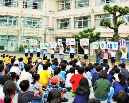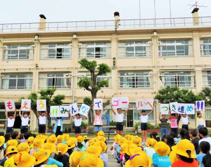 代表委員の子どもたちが考えた運動会のスローガン『もえろ!みんなでゴールへつき進め!』が発表されました。このスローガンに向けて、心を一つにしてほしいと思っています。