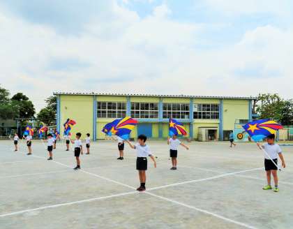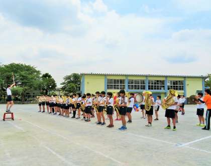 今日は、6年生鼓笛隊が校庭デビューです。暑い中でしたが、子どもたちは気持ちを込めて演奏しました。屋外に出ると音が反響せず、いつもと違う感覚があったと思いますが、本番通り、「ファンファーレ」「キングスコート」「聖者の行進」「校歌」の順に4曲を演奏しました。