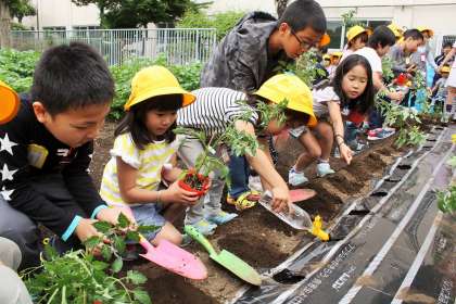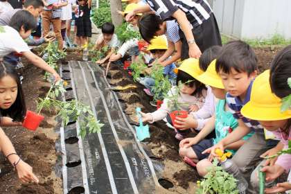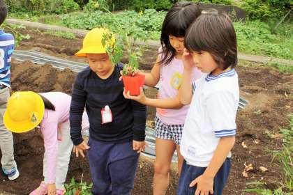 今日は畑に苗を植えました。1・3年生がトマト(1組)、なす(2組)ピーマン(3組)の苗を、2・4年生がきゅうりの苗を植えました。