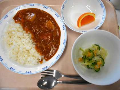 今日の給食は、子どもたちに人気の<ハッシュッドポークライス>です。砧小学校の給食は、ルーを小麦粉とバター・油で手作りしています。玉ねぎも、甘さがでるまで時間をかけて炒めています。