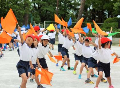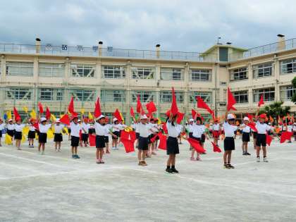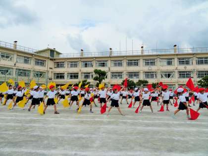 1・2年生の表現演技は「GO!5!ファイト砧っ子」です。旗を持って、元気いっぱいに踊ります。旗がなびく音がするように、腕をめいっぱい伸ばす練習をしています。