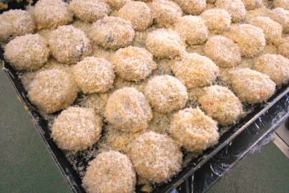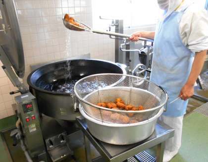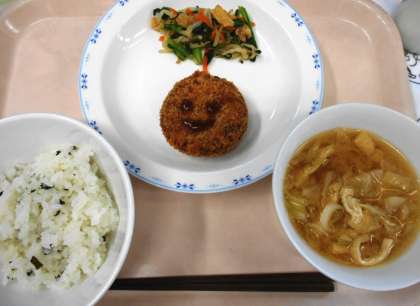 今日の主菜は、<ビーンズコロッケ>です。教室をまわって、「今日のコロッケに入っている豆は何でしょう?」とクイズを出したところ、いろいろな名前の豆が出てきました。正解の金時豆を知っている子も多く、「豆は苦手だけど、今日は食べられました。」と話してくれる子もいて、嬉しくなりました。