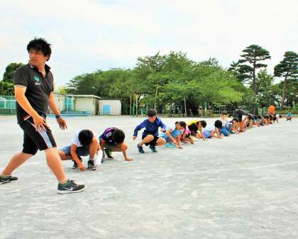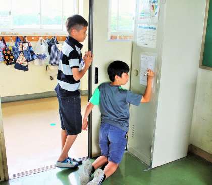 写真は、お掃除チェックをしている美化委員、スポーツテストのポイントを打っている運動委員の子どもたちの様子です。