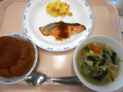 今日の給食の主菜は、<魚のバーベキューソース>です。今日は、北海道産の鮭を使いました。廊下ですれ違った子どもたちが、「今日は、バーベキューソースですよね?楽しみだな!」と話しかけてくれました。<バーベキュー>という響きに、楽しくておいしいイメージがある子が多いようですね。給食も、子どもたちが大人になった時に、おいしく楽しい時間だったと思い出してもらえたら嬉しいです。