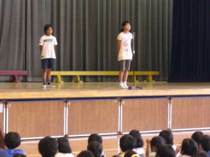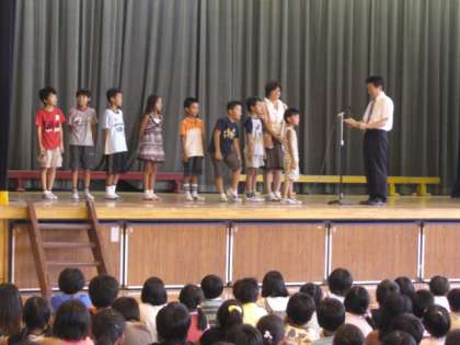 8月31日の教員研修会では、2学期の取り組みについて、学年・専科ごとにプレゼンをしました。始業式では、5年生がしっかりした声で、2学期の目標を発表しました。また、夏休みのプールに休まず参加した児童に皆勤賞が渡されました。