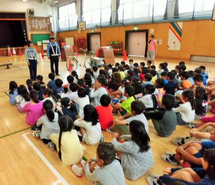 今日は、3年生の自転車安全教室がありました。成城警察署から2名の警察官が来てくださり、正しい自転車の乗り方のお話しと実技指導をていねいにしてくださいました。