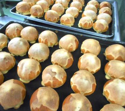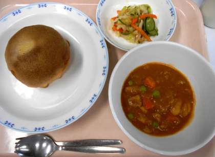 今日の給食は、<ビスキュイパン>です。子どもたちに人気があるメニューのひとつです。パンに小麦粉とバター・さとう・バニラオイル・たまごを混ぜて作ったクッキー生地を乗せて、オーブンで焼きました。教室をまわっていると、「今日のパン、とてもおいしかったです!」と笑顔で食べている子が多かったです。残食もほとんどなく、嬉しく思います。