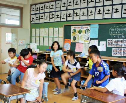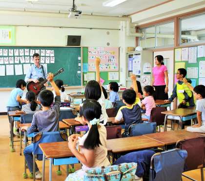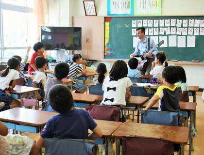 3・4年生の英語活動は、カナダ出身のジェフ先生と担任の先生との授業です。今回は、アルファベットや感情の表現を学習し、ジェフ先生のギターに合わせて歌を歌ったり、ジェスチャーをしたりして、楽しく英語と親しみました。