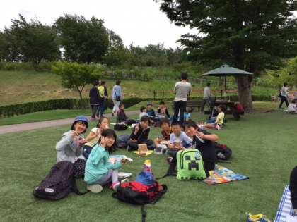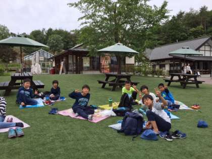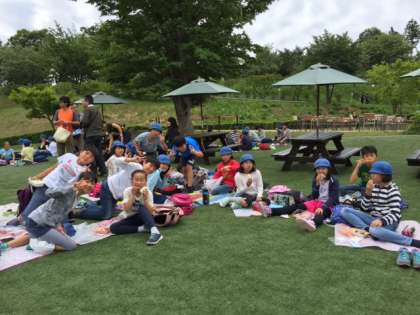 雄大な景色の中での昼食です。おいしいお弁当をありがとうございました。みんな元気です。