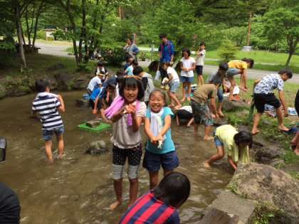 子どもたちは大喜びです。この後、マスの塩焼きとしていただきます。