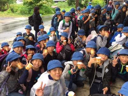 村めぐりをしています。りんご園では、甘くて濃厚なりんごジュースをいただきました。