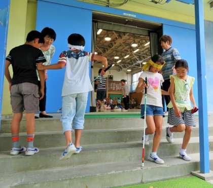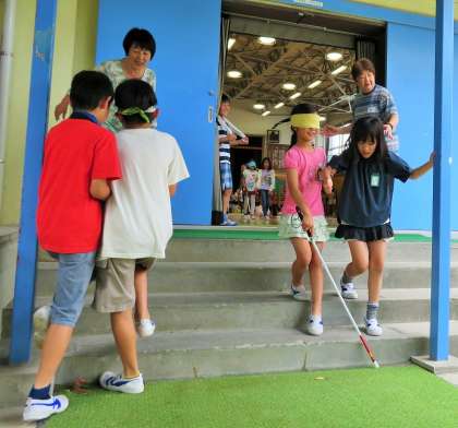 アイマスクの歩行体験では、前が見えない恐怖を体感しました。介助する役の人が半歩先に歩き、肘をつかんでもらい相手の人のペースに合わせてゆっくりと歩いていきます。階段などの障害物があるときには「階段がありますよ」「あと2段で終わります」などと声をかけています。