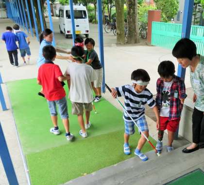 世田谷区社会福祉協議会の方々がご準備くださり、保護者の皆様にもお手伝いをいただきました。子どもたち一人一人が介助する側とされる側双方の貴重な体験ができました。ありがとうございました。