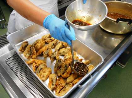 今日の給食の主菜は、<魚の香味揚げ>です。今日は、鯵を使いました。鯵は、初夏から夏にかけておいしい時期をむかえる魚です。
