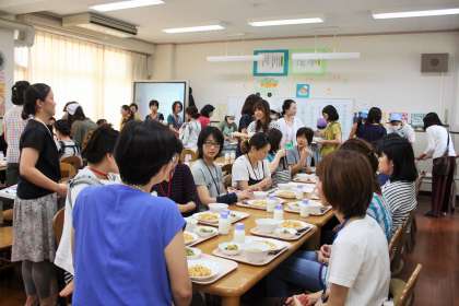 先日、保護者の皆さんを対象に給食試食会が開催されました。58名の保護者の皆さんがご参加くださり、栄養士から砧小学校の給食について説明をさせていただきました。