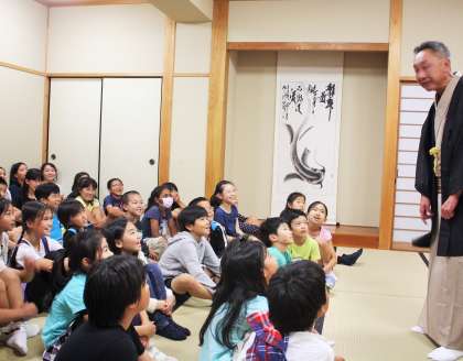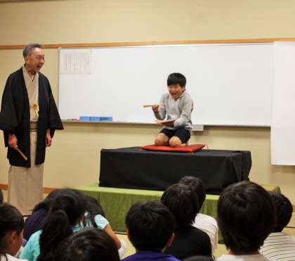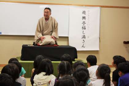まずは、扇子を使って、そばやうどんを食べる仕草や刀を振り下ろす仕草、何も持たずにまんじゅうを食べる仕草に子どもたちは大笑いです。その後、高座に上がっていただき、落語「青菜」を見せていただきました。子どもたちは、たくさん笑い、落語の面白さを知り、とても有意義なひとときになりました。