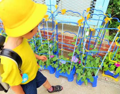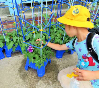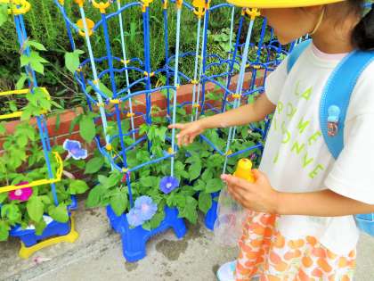 1年生が種をまいてから毎日水をあげ、大切に育ててきた朝顔の花が咲いています。「見て見て、花が咲いたよ!」「色んな色の花が咲いてるよ!」などなど、子どもたちは笑顔で嬉しそうに話しています。