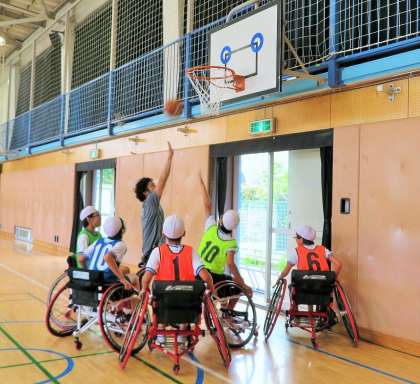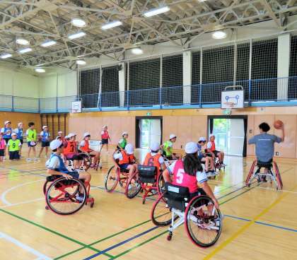 障がい者理解を目的とした車椅子バスケット体験では、競技用車椅子に乗り、リレーやシュート練習、そして堀江さんと一緒にゲームを行いました。堀江さんの巧みな動きやシュートに子どもたちはびっくりです!