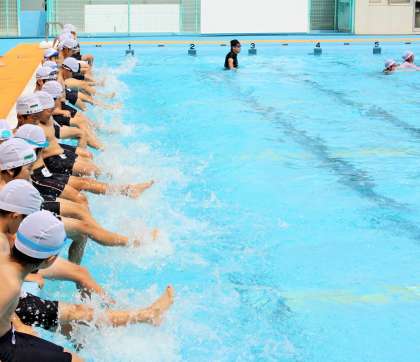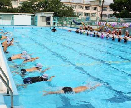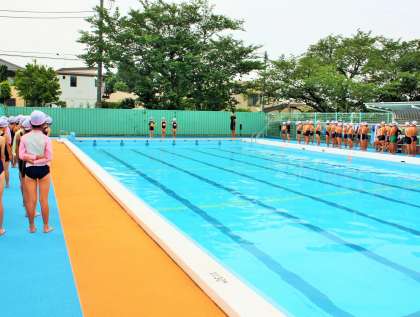 3年生は絶好のお天気の下、水泳学習のルールをみんなで確認し、プールに入り水慣れをしました。