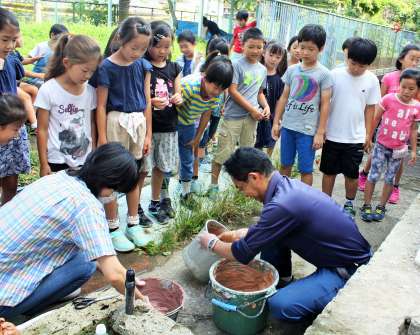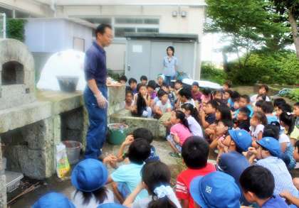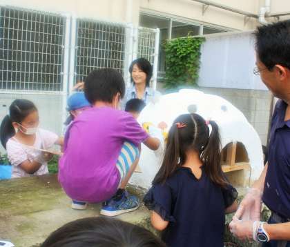 今日は3年生の食育で「ピザを作ろう」です。まずは、ピザ窯「たぬき号」の色塗りです。夏休みのサマースクール講座「ピッツァを作って食べよう」が大人気のため3月に着手したピザ窯の色塗りです。
