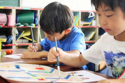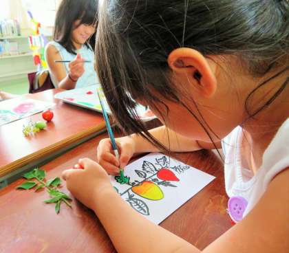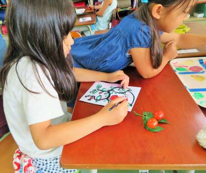 収穫したミニトマトの絵手紙を描きました。画用紙いっぱいに、ミニトマトの輪郭を筆ペンで描き、その上に絵具を塗りました。