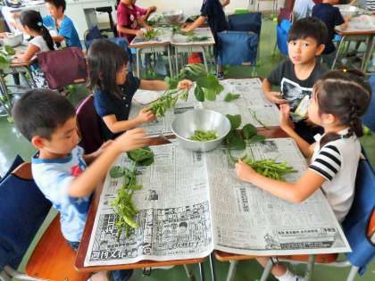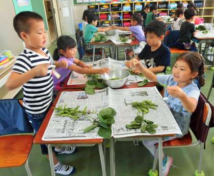 今日は1年生が、生活科の時間に枝豆のさやもぎをしました。今日の給食に出る枝豆のものです。
