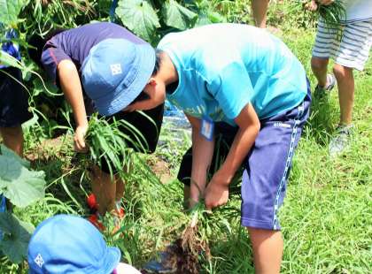 今日は5年生が「砧っ子農園」で育てていたキュウリを収穫しました。高学年の5年生は、まず畑の雑草を抜きをしてくれました。その後にキュウリの収穫です。
