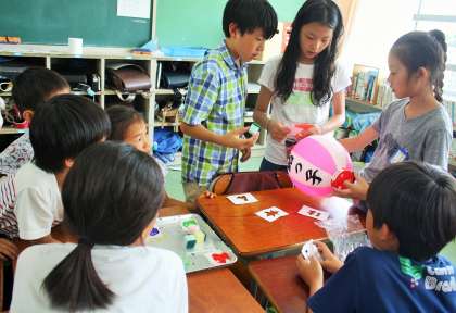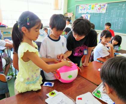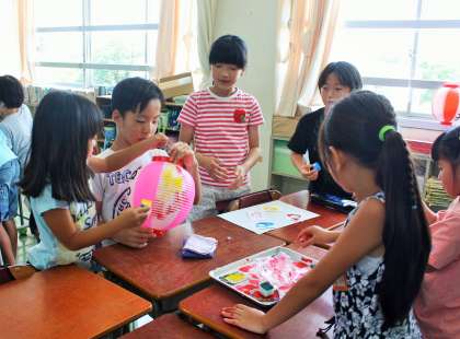 高学年の子どもたちが、ちょうちんをしっかり引っ張って持ちながら、ポンポンポンと色を付けていきました。