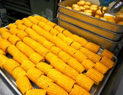 今日の給食はの副菜は、<とうもろこし>です。今日のとうもろこしは、2年生が一生懸命に皮むきをしたものです。その数は、全部で170本。いつも給食をもりもり食べている2年生、とうもろこしのひげもきちんと取って、とても上手に素早く皮むきしてくれました。
