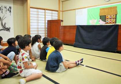 先日、1年生と2年生が、人形劇同好会(卒業生の保護者)の方々による人形劇を見せていただきました。子どもたちは、劇の世界を楽しく味わうことができました。手作りの人形劇で、様々な仕掛けや工夫がありました。背景やナレーション、効果音も素敵でした!