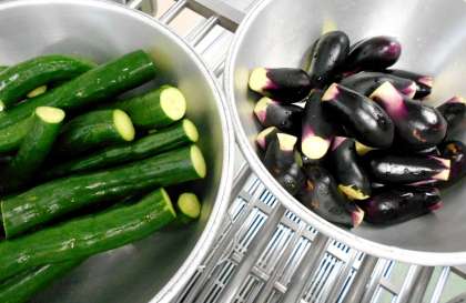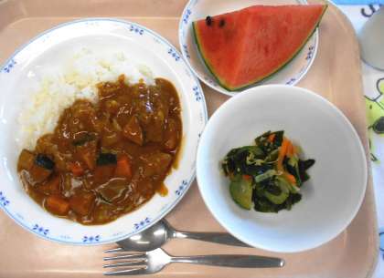今日の給食の<夏野菜のカレーライス>には、朝収穫した砧っ子農園のなすとプチトマトを使いました。<和風サラダ>には、砧っ子農園のきゅうりを使いました。子どもたちと先生方が愛情をこめて育てた夏野菜も加わり、さらにおいしく仕上がりました。