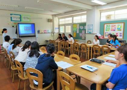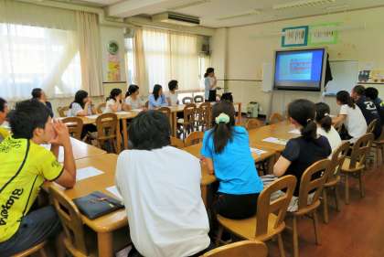 食物アレルギーに関する研修会で、講師は養護教諭です。最初に、食物アレルギーでアナフィラキシーショックを起こした他校の事例をもとに、緊急時の役割分担等について確認を行いました。そして食物アレルギー事故に関する認識をより深めるため、教材DVDを観ました。
