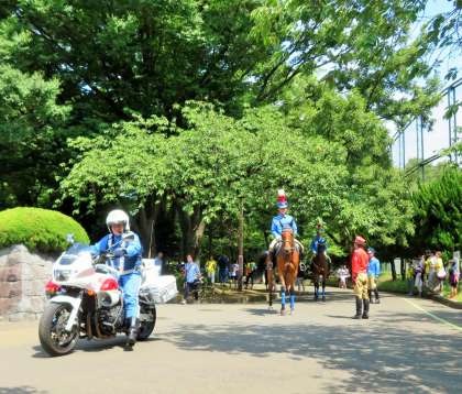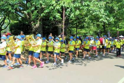 第30回砧っ子夏祭りが盛大に開催されました。まずは、6年生鼓笛隊のパレードです。白バイ、お馬さんを先頭に総合運動場を出発し、学校まで「ファンファーレ」「キングスコート」「聖者の行進」「校歌」の4曲を3回演奏しました。