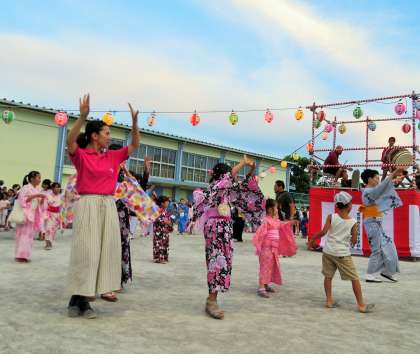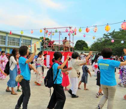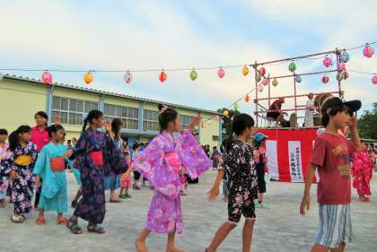 地域の方々や保護者の皆さん、先生たちも一緒になって、楽しく盆踊りをしました。