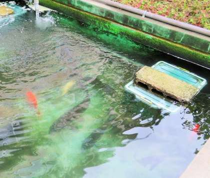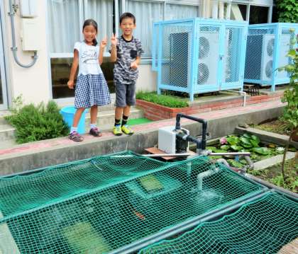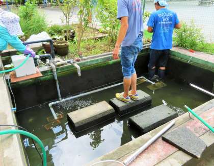 学校の主事さん、事務さんが鯉の池をきれいにしています。においもきつく掃除は簡単ではないのですが、「子どもたちに喜んでもらいたい!」その一心で取り組んでいます。なんと、池の水の循環装置は手作りです。子どもたちからエサをもらう鯉も嬉しそうです!