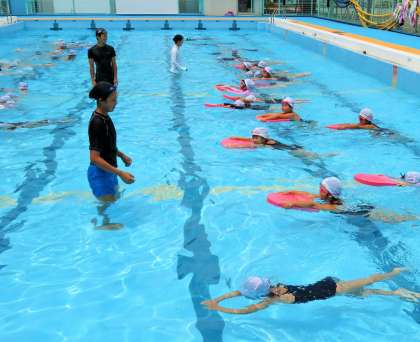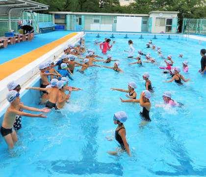 水の中でもぐったり、走ったり、浮いたりと、いろいろな動きを通して水に親しんでいます。けのびやバタ足など、初歩的な泳ぎにも取り組んでいます。