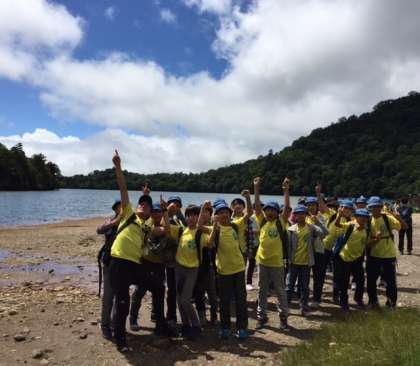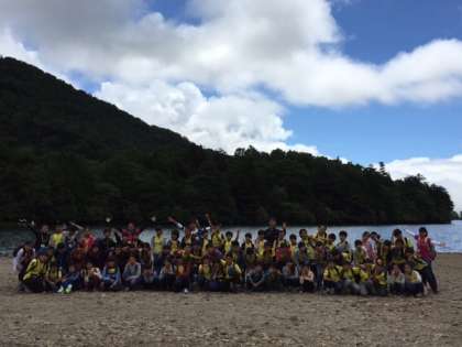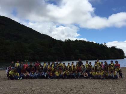 湯ノ湖です。奇跡的に青空が広がっています。湯ノ湖は、白根山からの水に加えて、湖畔にある湯元温泉からの湯が流れ込んでいます。これからハイキングスタートです。
