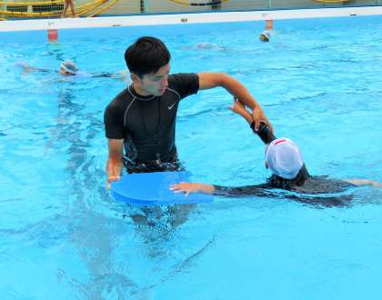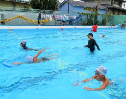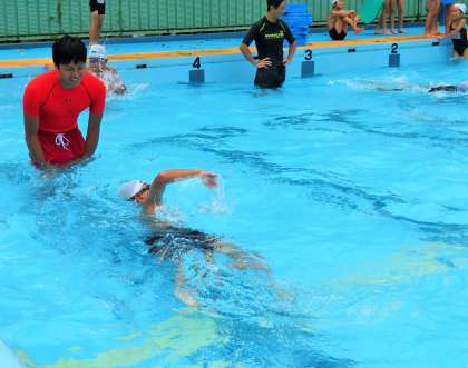 朝方は曇っていましたが、久しぶりに太陽も顔をだし、気温は31度まで上がりました。水の中は27度と少し冷たく感じました。子どもたちは、自分自身の課題を克服しようと真剣に取り組んでいます。