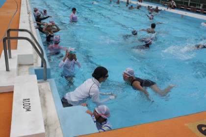 バディのペアで、交互に「5分間泳ぎ」をしました。ペアの友達を応援しながら息を整え、自分の番を待ちます。どの子も互いに声をかけながら一生懸命泳いでいました。3人のバディには先生も参加しました。