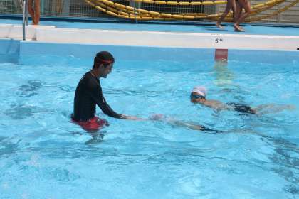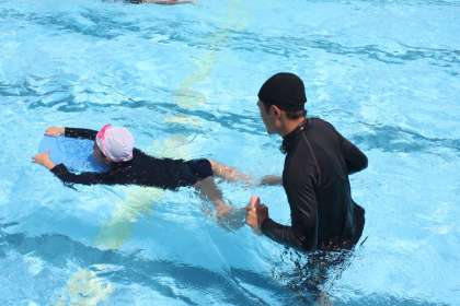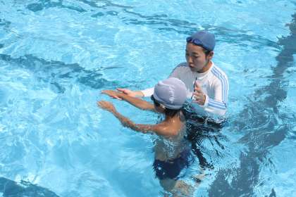 「『足で水を挟むように』『耳を手につけるように』『そうそう、よくなっているよ』と、先生方の指導の声がプールの外まで聞こえました。熱い指導いいですね。」と、来校されたお客様がおしゃっていました。