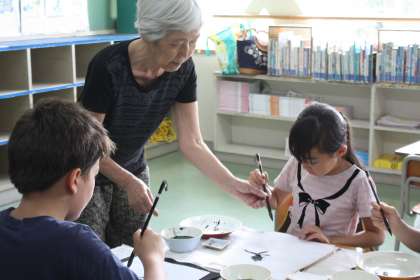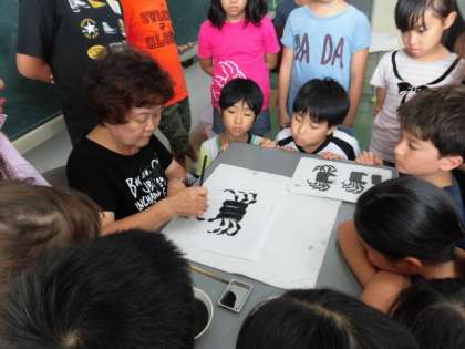 サマースクール「墨で絵を描こう」は、3年生以上を対象に行いました。講師は倉沢先生です。「金魚」と「蟹」を描くというテーマで、まずは倉沢先生がお手本として墨絵を描いて見せてくださいました。食い入るように真剣に見つめる子どもたち。いよいよ体験の始まりです。筆に水をたっぷりつけて描き始めていくと、段々と思いがふくらんでそれぞれが思うままに自分の金魚・蟹を表現していきました。一人ひとり違った味わいのある作品が出来上がりました。