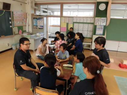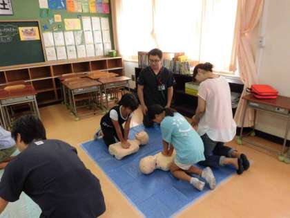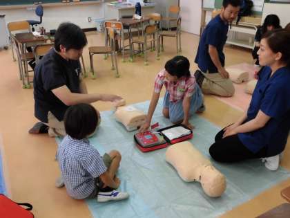 まず『人の命を救うために小学生にもできること』を学んだ後に、心肺蘇生法の流れを実習しました。とても丁寧で、かつ小学生に分かりやすい講習で感動しました。