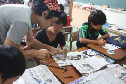 サマースクール「たたいて作ろうアルミプレート」は、5.6年生が対象の講座です。講師は、1年生、6年生の保護者の韮澤さんです。始めに伝統工芸についての勉強をしました。機械を使って加工ではなく、職人さんが直接手を加えていくところに価値があります。金属を使った伝統工芸品には鋳金、鍛金、彫金などがありますが、今回はたがねを使っての彫金です。作業が始まりました。自分が考えたデザインをアルミプレートに写し、たがねで加工していきます。打ち付け方を工夫することで、平面だったアルミプレートが少しずつ立体的になってきます。できあがっていくその立体感に子どもたちは嬉しそうな表情を浮かべていました。細かく難しいところは、韮澤さんが手伝ってくれました。最後は表面を磨き、ピカピカのオリジナルアルミプレートの完成です。