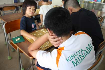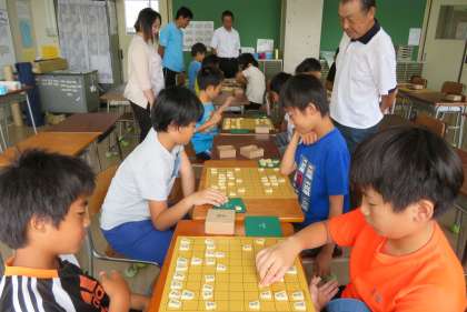 講師は、棋士の西村先生、野田澤先生、指導員で2年生のおじい様の石井さんです。丁寧に教えて頂き、ありがとうございました。ボランティアで参加した学び舎中学生も小学生のお世話をしたり、小学生と対局をしたりして一緒に楽しんでいました。